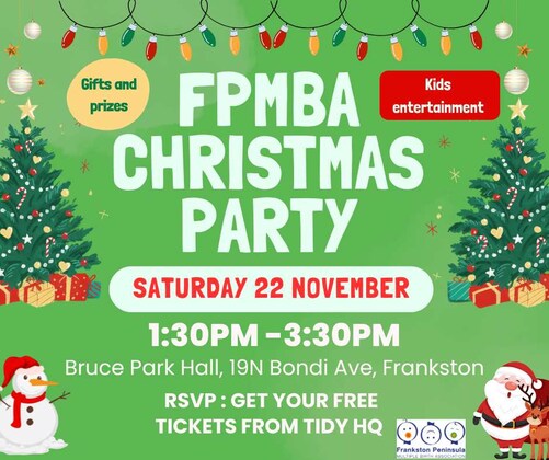 Join us for our 2025 Christmas Party! Kids entertainment by Jacob from Yarnberg Entertainment Gifts for all families and giveaway prizes included Saturday 22nd November 1.30pm-3.30pm Free for FPMBA members, please rsvp by selecting free tickets for each member of them family who is attending